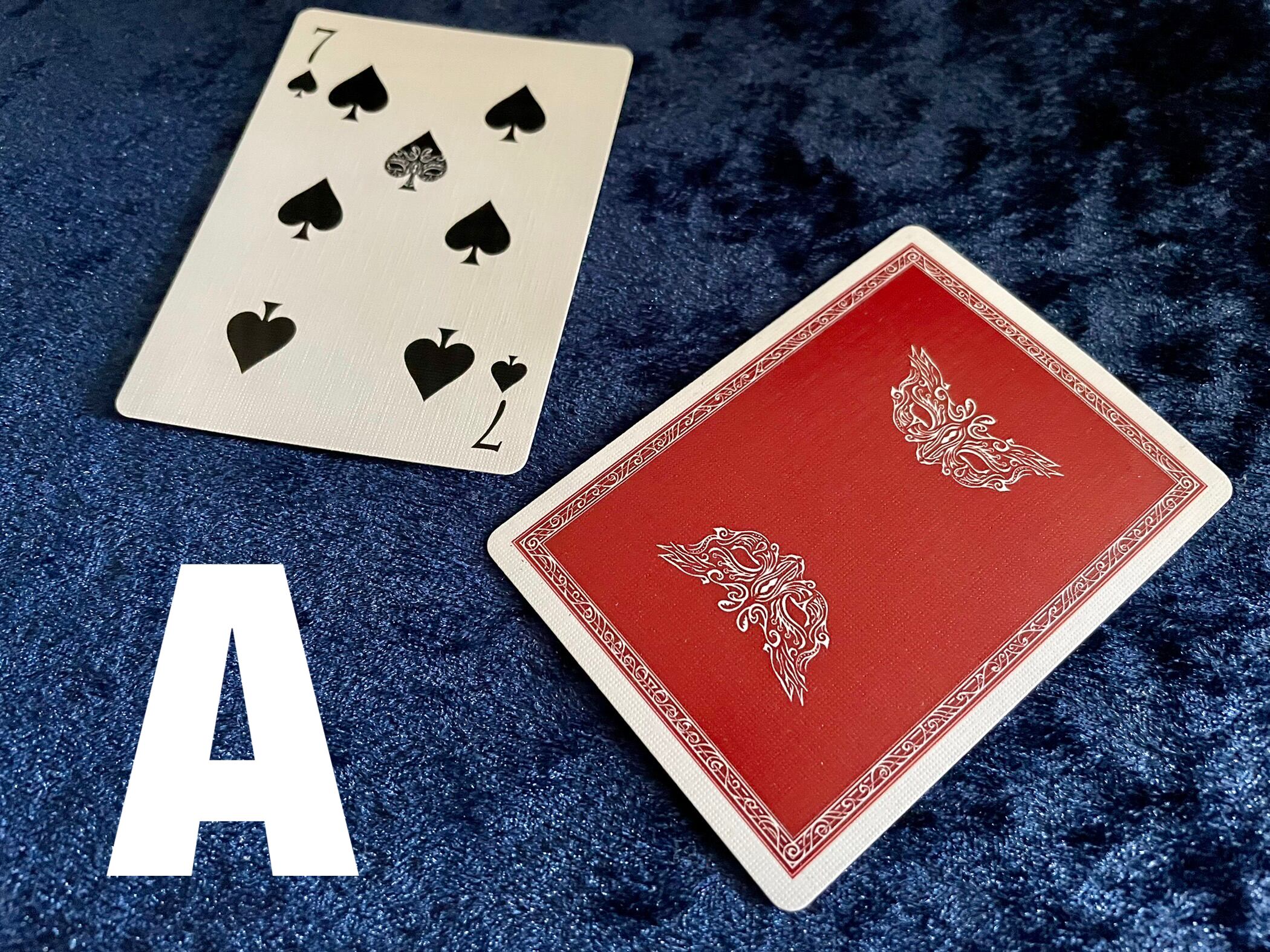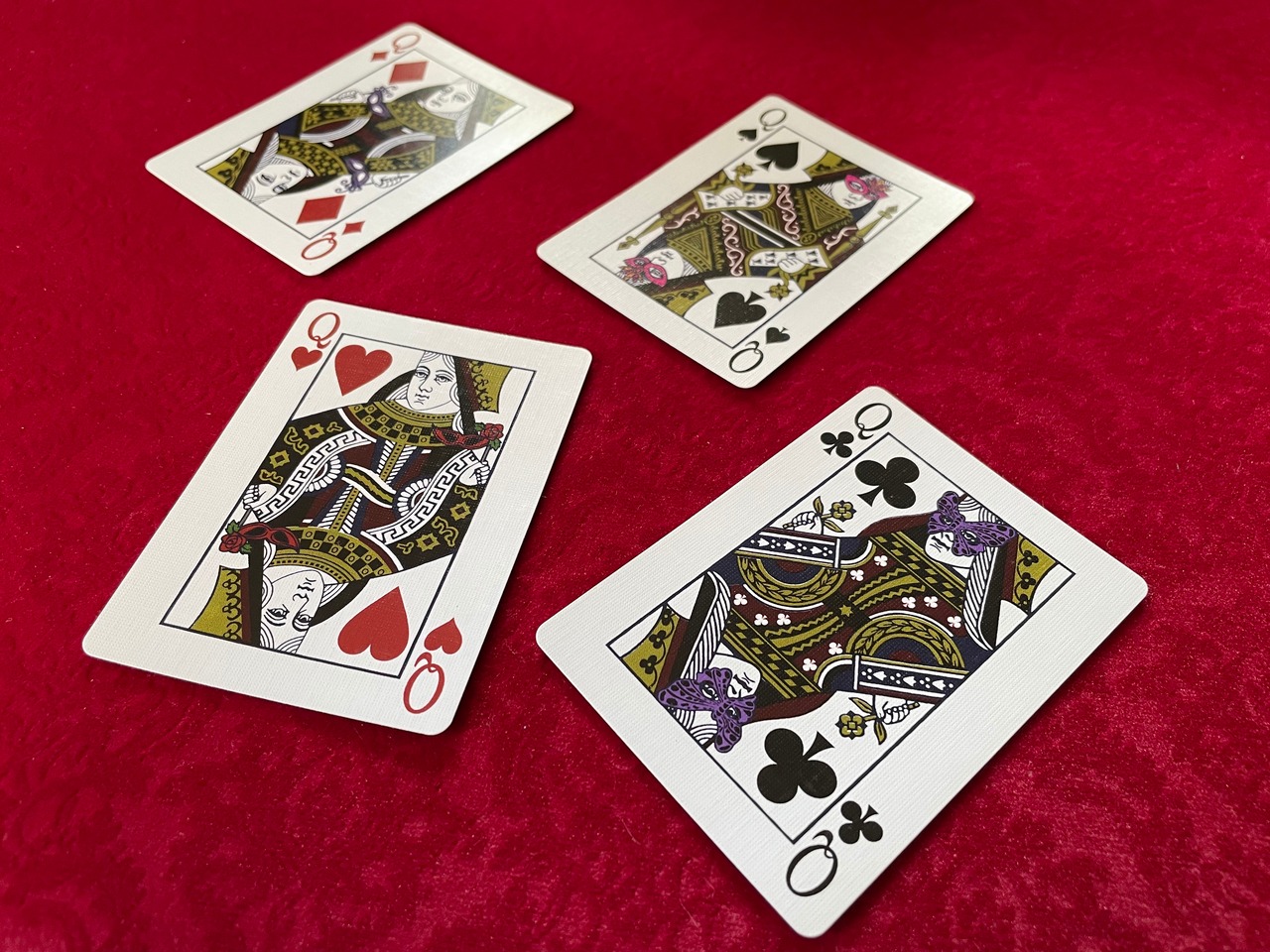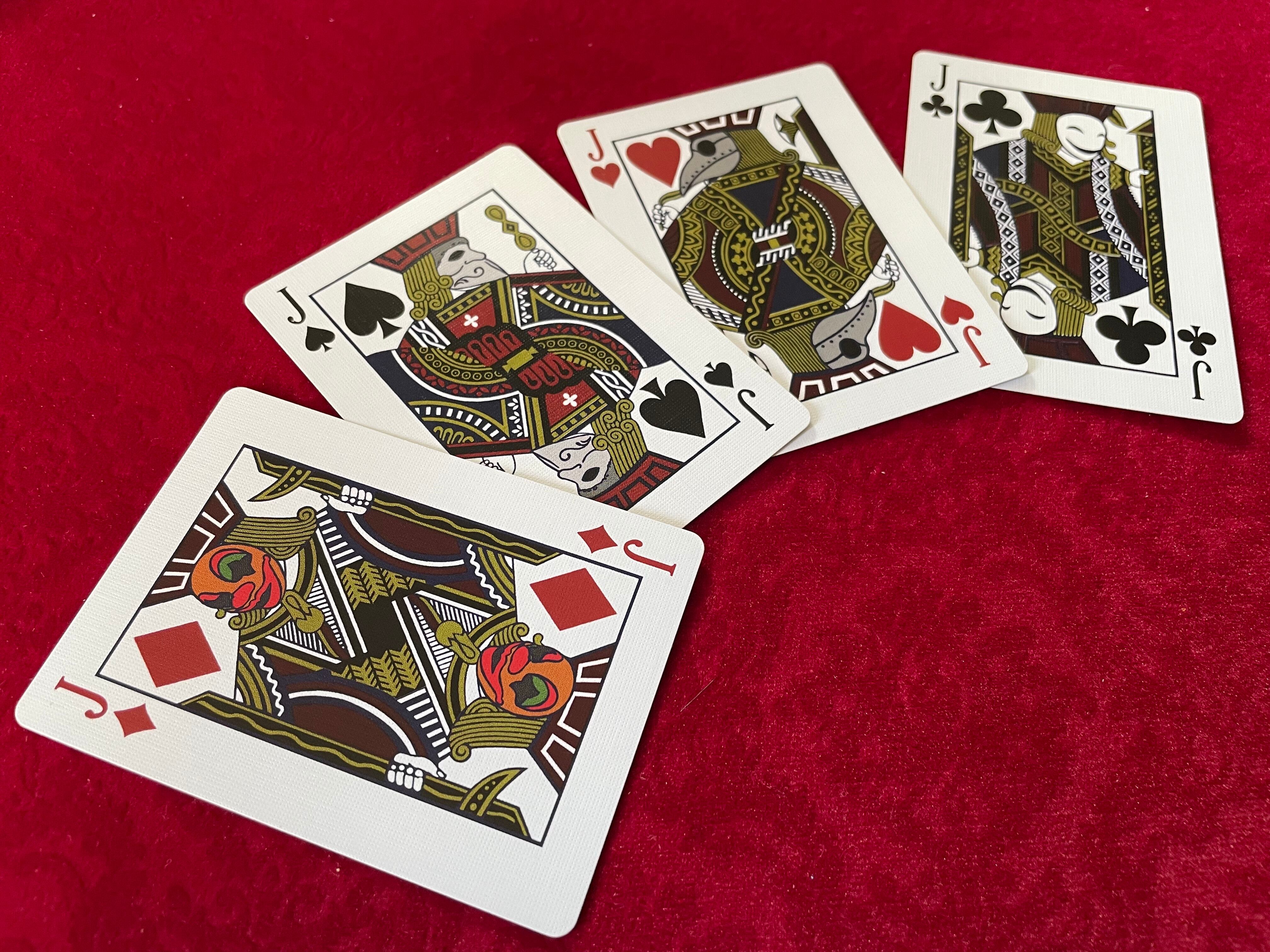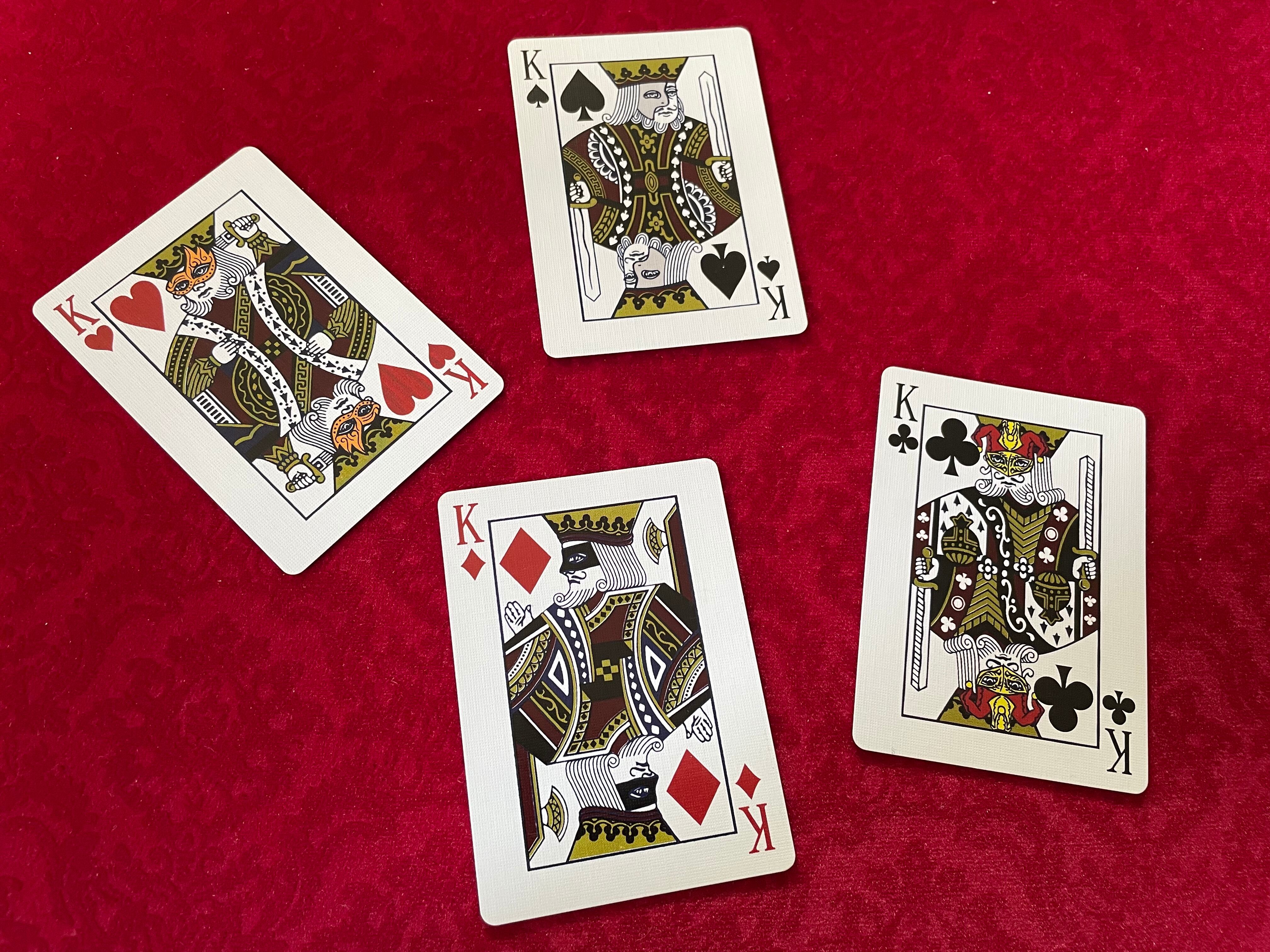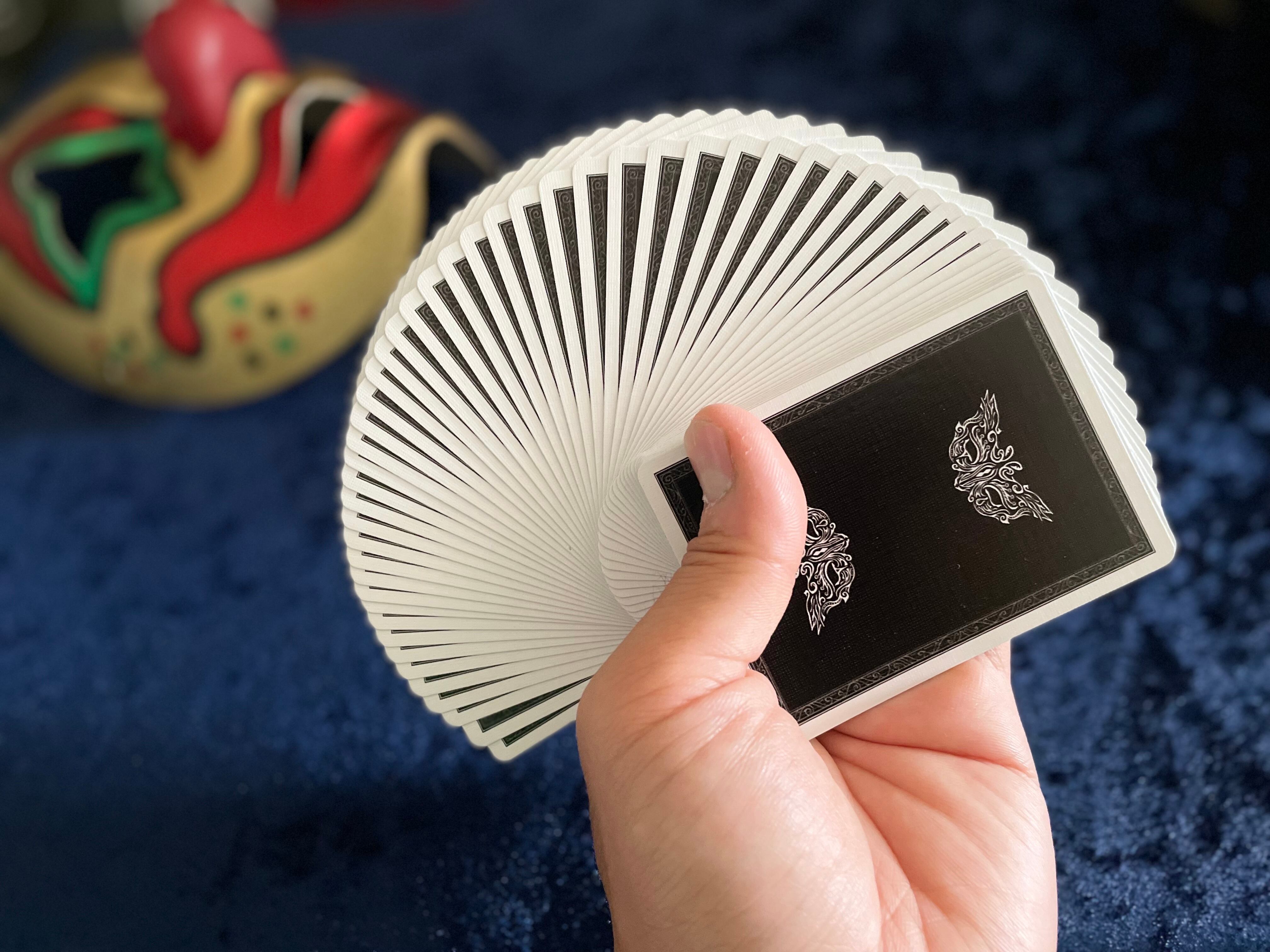 最大の特徴は絵札で、J,Q,Kの全ての人物が仮面を被ったり手にしている遊び心のあるデザインとなっております。個性的なJ、華やかなQ、威厳にあふれたK。ユニークでありながらも特にQはマジックのカウント技法にも配慮したデザインとなっております。見た目に楽しいデザインはマジックをされない方にもお勧めできます。